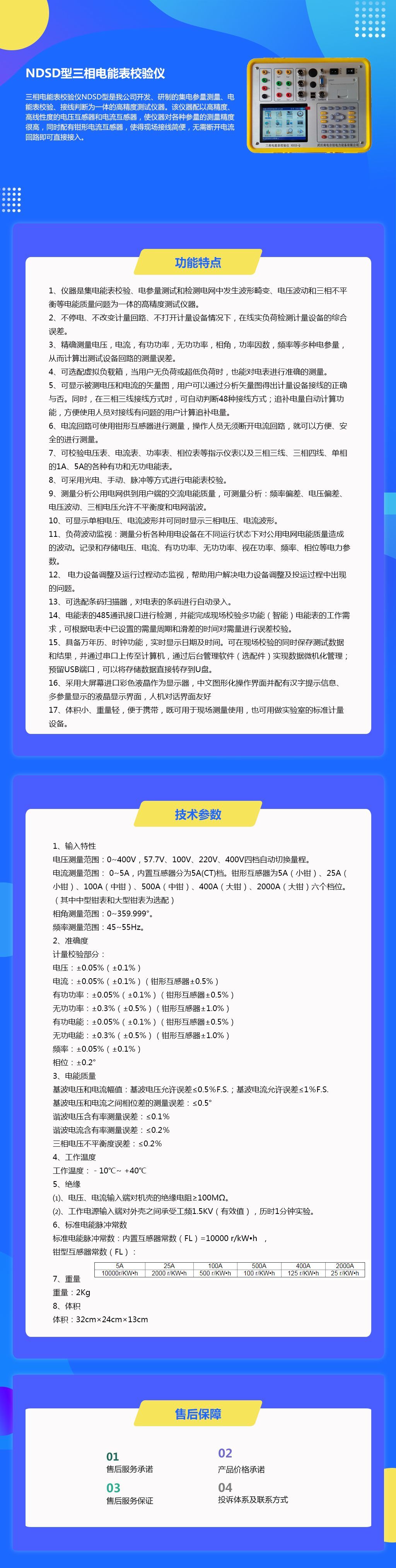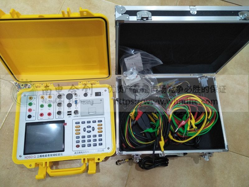 三相电能表校验仪NDSD型是我公司开发、研制的集电参量测量、电能表校验、接线判断为一体的高精度测试仪器。该仪器配以高精度、高线性度的电压互感器和电流互感器,使仪器对各种参量的测量精度很高,同时配有钳形电流互感器,使得现场接线简便,无需断开电流回路即可直接接入。