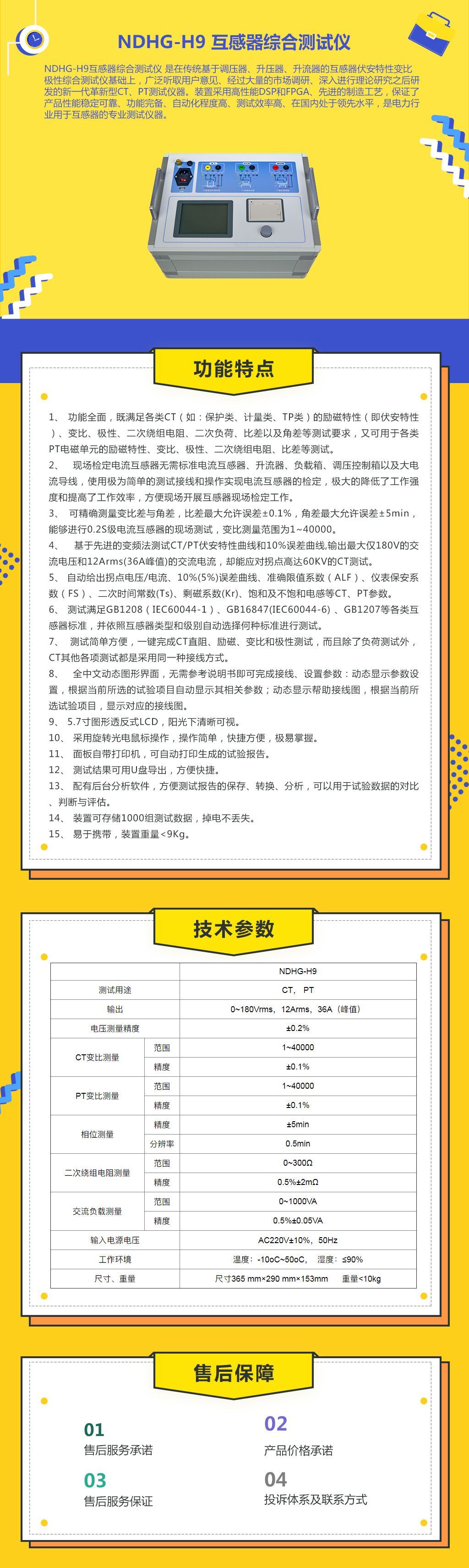 NDHG-H9互感器综合测试仪 是在传统基于调压器、升压器、升流器的互感器伏安特性变比极性综合测试仪基础上,广泛听取用户意见、经过大量的市场调研、深入进行理论研究之后研发的新一代革新型CT、PT测试仪器。装置采用高性能DSP和FPGA、先进的制造工艺,保证了产品性能稳定可靠、功能完备、自动化程度高、测试效率高、在国内处于领先水平,是电力行业用于互感器的专业测试仪器。