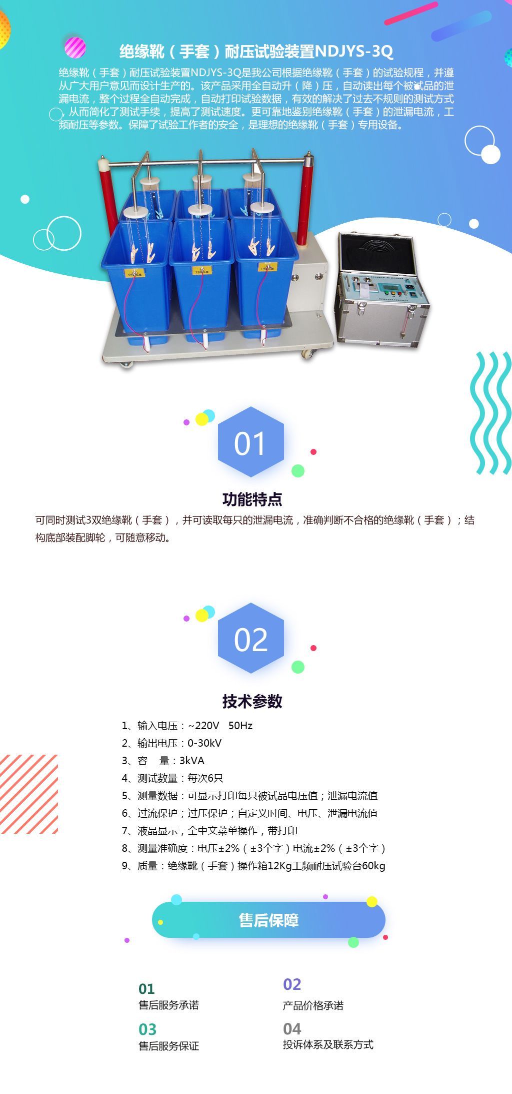 绝缘靴(手套)耐压试验装置NDJYS-3Q是我公司根据绝缘靴(手套)的试验规程,并遵从广大用户意见而设计生产的。该产品采用全自动升(降)压,自动读出每个被试品的泄漏电流,整个过程全自动完成,自动打印试验数据,有效的解决了过去不规则的测试方式,从而简化了测试手续,提高了测试速度。更可靠地鉴别绝缘靴(手套)的泄漏电流,工频耐压等参数。保障了试验工作者的安全,是理想的绝缘靴(手套)专用设备。其主要特点:可同时测试3双绝缘靴(手套),并可读取每只的泄漏电流,准确判断不合格的绝缘靴(手套);结构底部装配脚轮,可随意移动。
