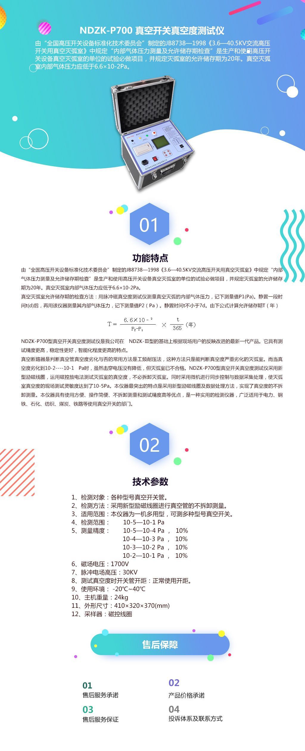 NDZK-P700型真空开关真空度测试仪是我公司在 NDZK-Ⅲ型的基础上根据现场用户的反映改进的最新一代产品。它具有测试精度更高,稳定性更好,智能化程度更高的特点。