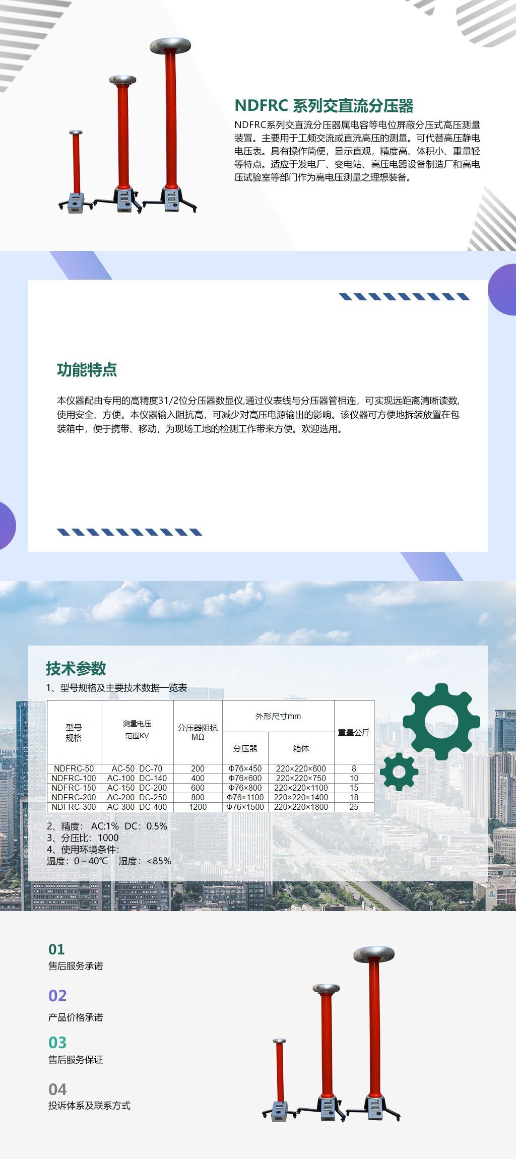 NDFRC系列交直流分压器属电容等电位屏蔽分压式高压测量装置。主要用于工频交流或直流高压的测量。可代替高压静电电压表。具有操作简便,显示直观,精度高、体积小、重量轻等特点。适应于发电厂、变电站、高压电器设备制造厂和高电压试验室等部门作为高电压测量之理想装备。