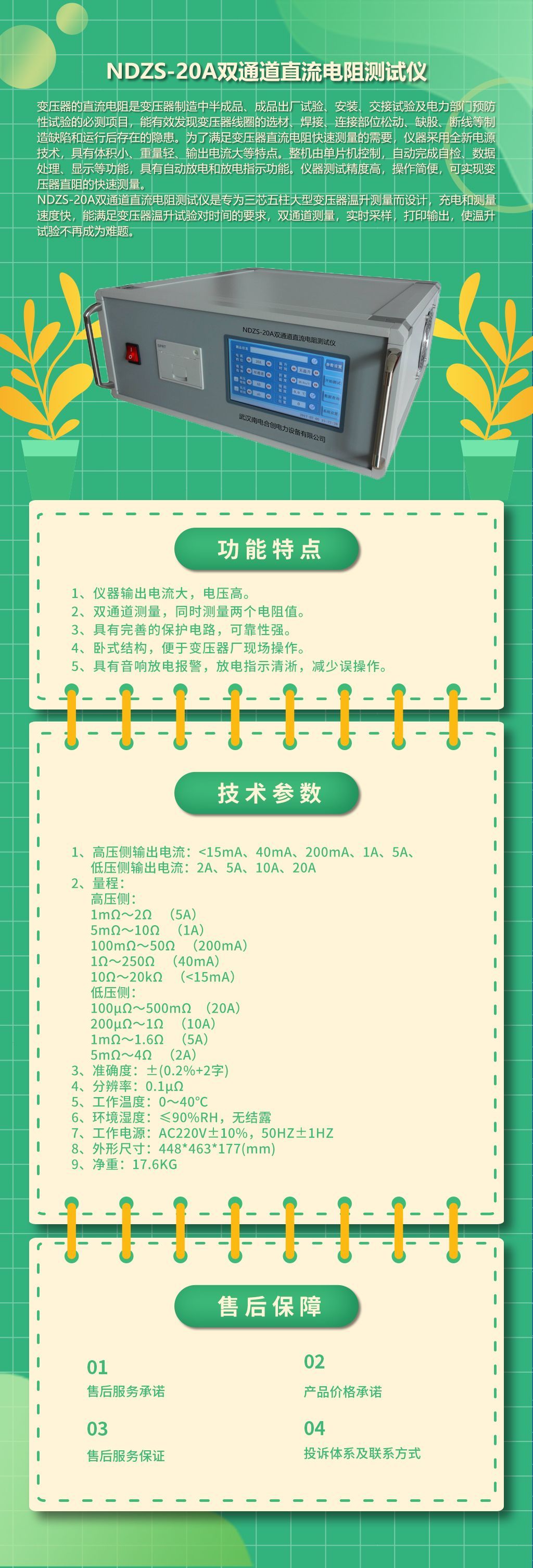 NDZS-20A双通道直流电阻测试仪是专为三芯五柱大型变压器温升测量而设计,充电和测量速度快,能满足变压器温升试验对时间的要求,双通道测量,实时采样,打印输出,使温升试验不再成为难题。
