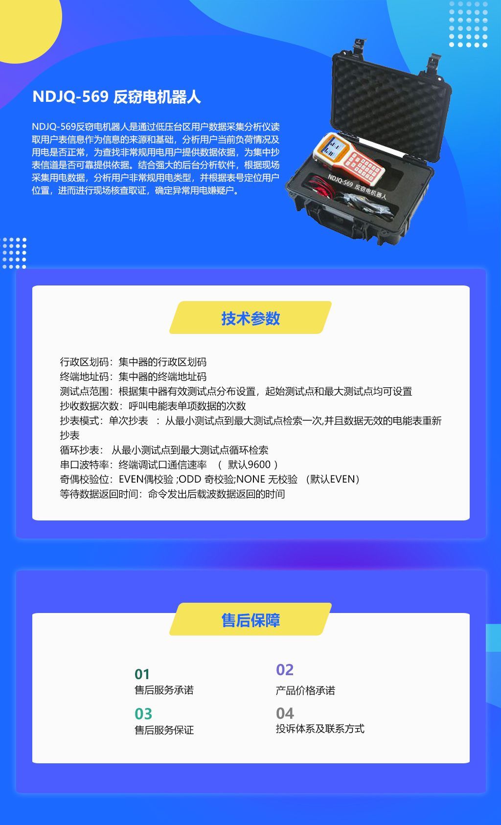 NDJQ-569反窃电机器人是通过低压台区用户数据采集分析仪读取用户表信息作为信息的来源和基础,分析用户当前负荷情况及用电是否正常,为查找非常规用电用户提供数据依据,为集中抄表信道是否可靠提供依据。结合强大的后台分析软件,根据现场采集用电数据,分析用户非常规用电类型,并根据表号定位用户位置,进而进行现场核查取证,确定异常用电嫌疑户。