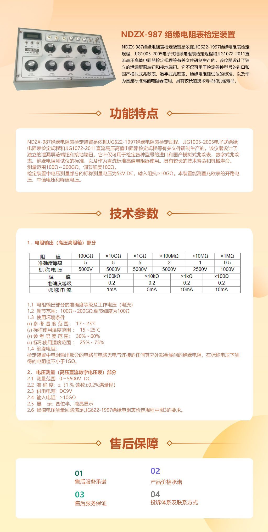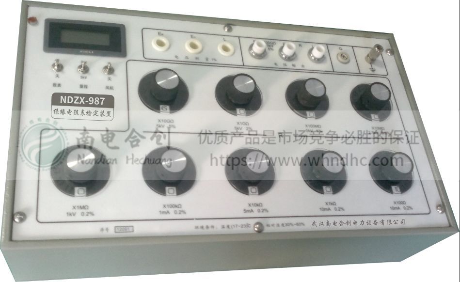 NDZX-987绝缘电阻表检定装置是依据JJG622-1997绝缘电阻表检定规程、JJG1005-2005电子式绝缘电阻表检定规程和JJG1072-2011直流高压高值电阻器检定规程等有关文件研制生产的。该仪器设计了独立的泄漏屏蔽端钮和接地端钮。它不仅可用于检定各种型号的进口和国产模拟式兆欧表、数字式兆欧表、绝缘电阻测试仪的标准,以及作为直流标准高值电阻器使用。具有较长的技术寿命和机械寿命。