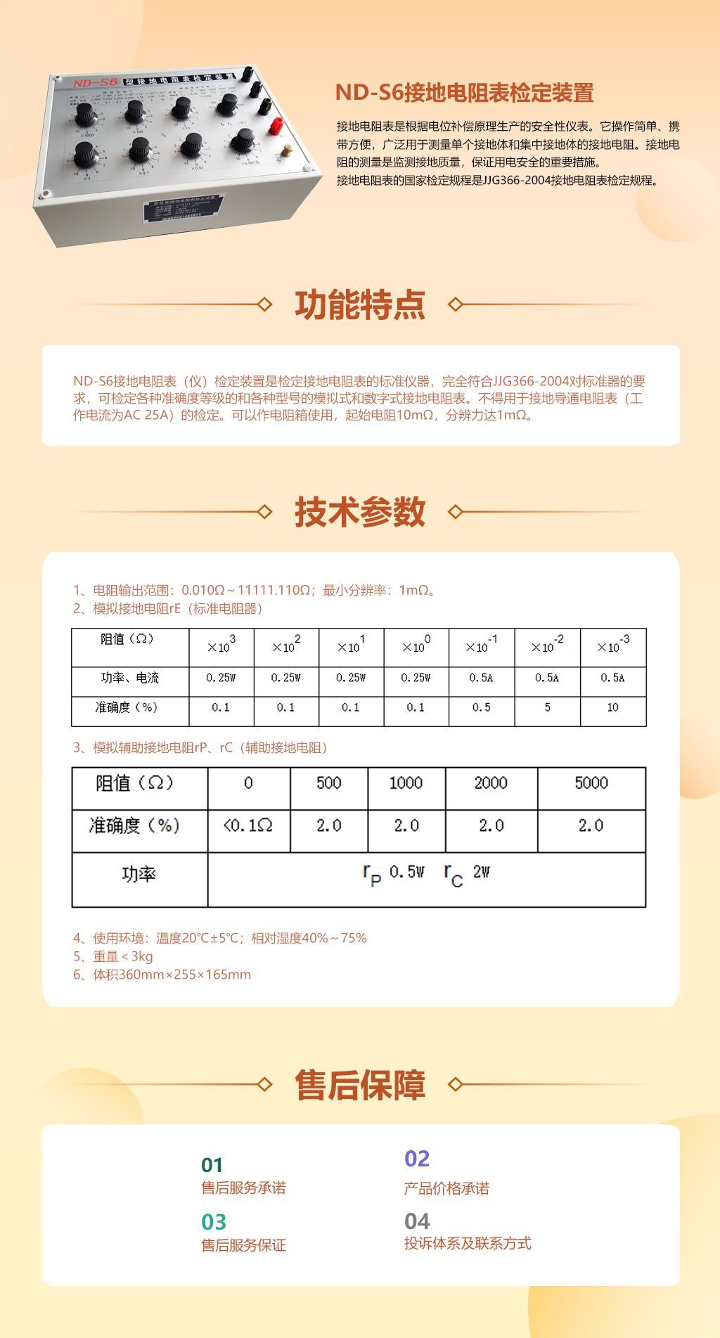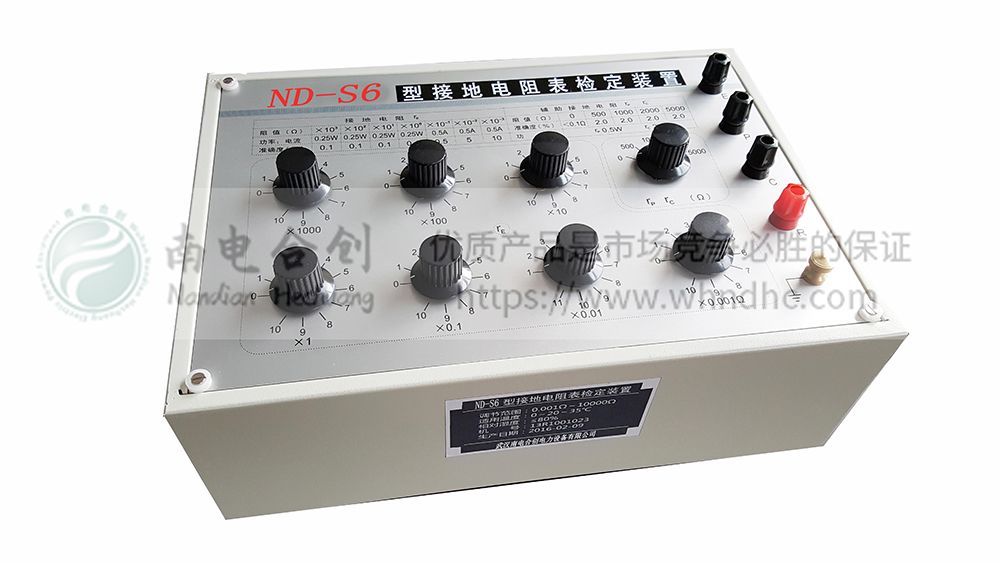 ND-S6接地电阻表(仪)检定装置是检定接地电阻表的标准仪器,完全符合JJG366-2004对标准器的要求,可检定各种准确度等级的和各种型号的模拟式和数字式接地电阻表。不得用于接地导通电阻表(工作电流为AC 25A)的检定。可以作电阻箱使用,起始电阻10mΩ,分辨力达1mΩ。