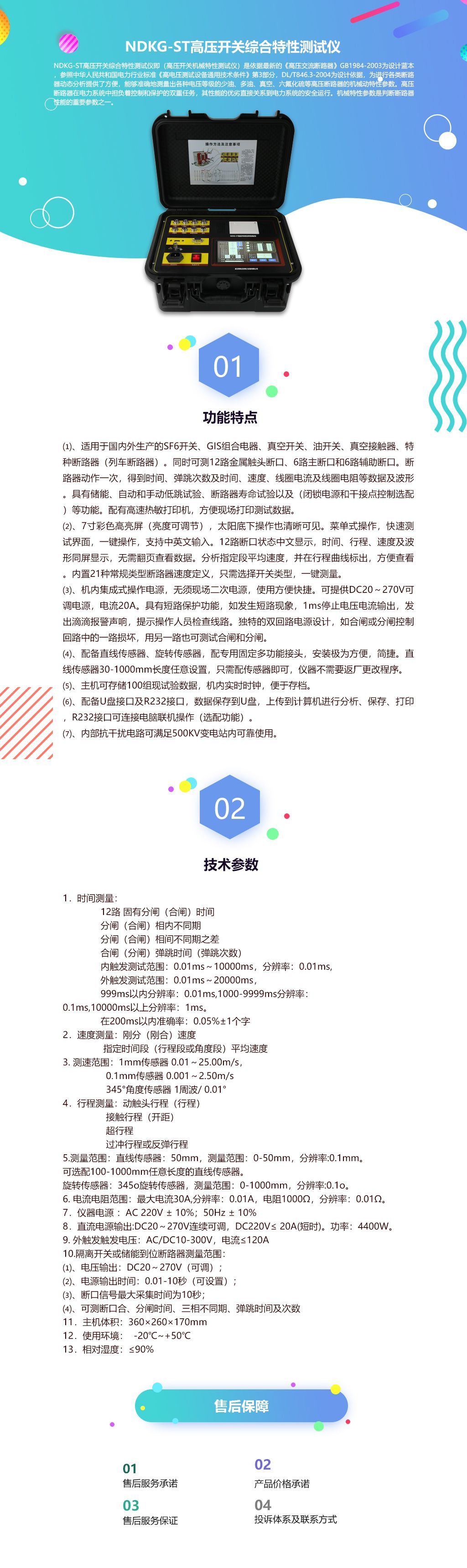 随着社会的发展,人们对用电的安全可靠性要求越来越高,高压断路器在电力系统中担负着控制和保护的双重任务,其性能的优劣直接关系到电力系统的安全运行。机械特性参数是判断断路器性能的重要参数之一。NDKG-ST高压开关综合特性测试仪即(高压开关机械特性测试仪)是依据最新的《高压交流断路器》GB1984-2003为设计蓝本,参照中华人民共和国电力行业标准《高电压测试设备通用技术条件》第3部分,DL/T846.3-2004为设计依据,为进行各类断路器动态分析提供了方便,能够准确地测量出各种电压等级的少油、多油、真空、六氟化硫等高压断路器的机械动特性参数。高压断路器在电力系统中担负着控制和保护的双重任务,其性能的优劣直接关系到电力系统的安全运行。机械特性参数是判断断路器性能的重要参数之一。
