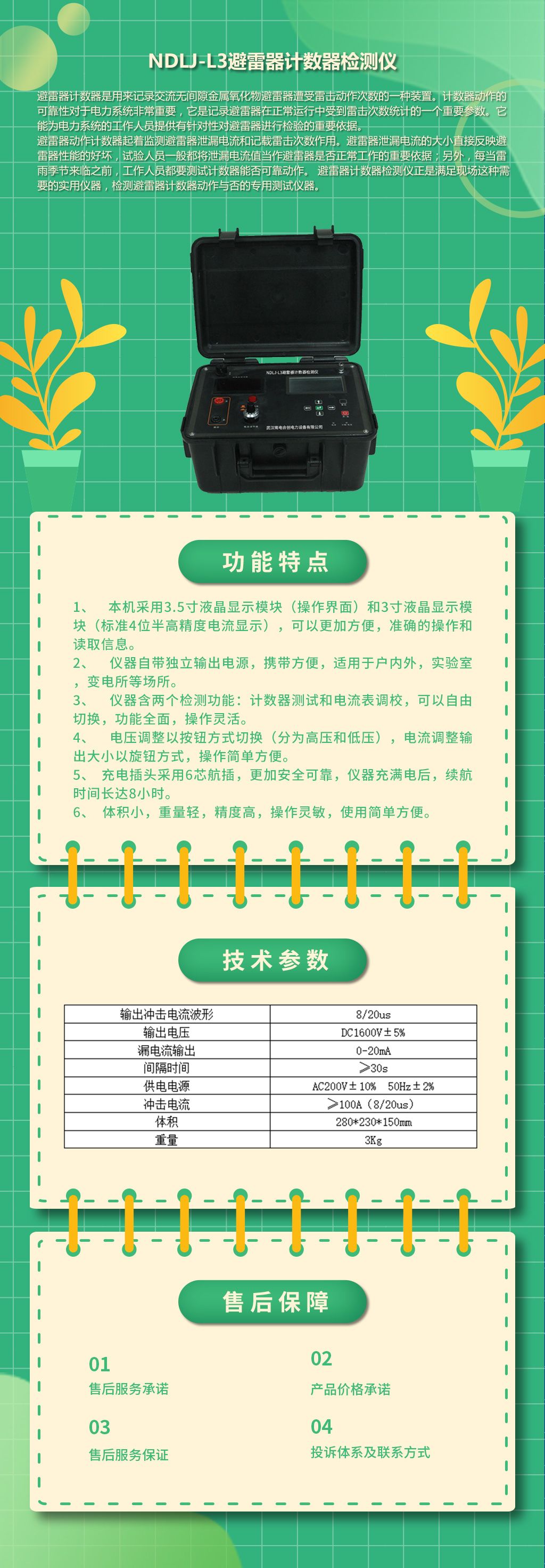 避雷器动作计数器起着监测避雷器泄漏电流和记载雷击次数作用。避雷器泄漏电流的大小直接反映避雷器性能的好坏,试验人员一般都将泄漏电流值当作避雷器是否正常工作的重要依据;另外,每当雷雨季节来临之前,工作人员都要测试计数器能否可靠动作。 避雷器计数器检测仪正是满足现场这种需要的实用仪器,检测避雷器计数器动作与否的专用测试仪器。