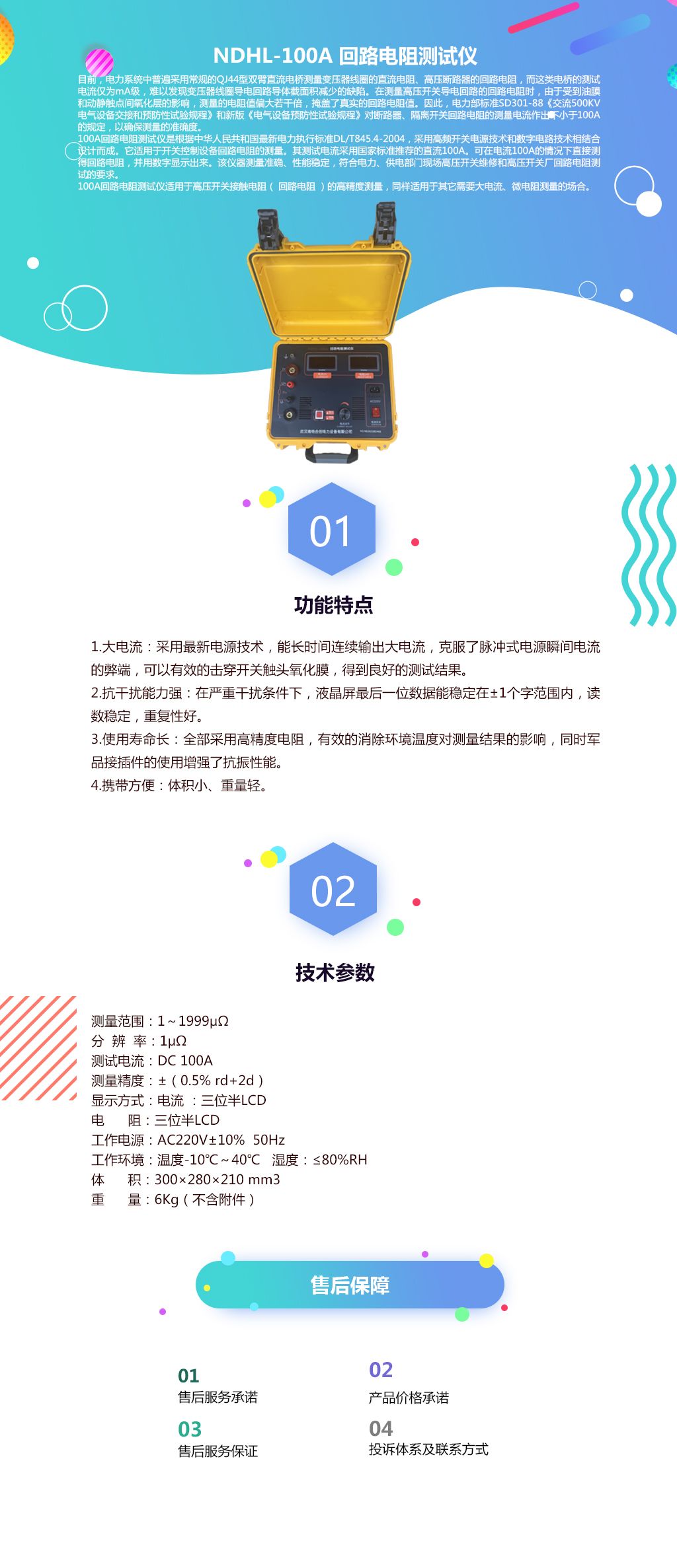 100A回路电阻测试仪是根据中华人民共和国最新电力执行标准DL/T845.4-2004,采用高频开关电源技术和数字电路技术相结合设计而成。它适用于开关控制设备回路电阻的测量。其测试电流采用国家标准推荐的直流100A。可在电流100A的情况下直接测得回路电阻,并用数字显示出来。该仪器测量准确、性能稳定,符合电力、供电部门现场高压开关维修和高压开关厂回路电阻测试的要求。