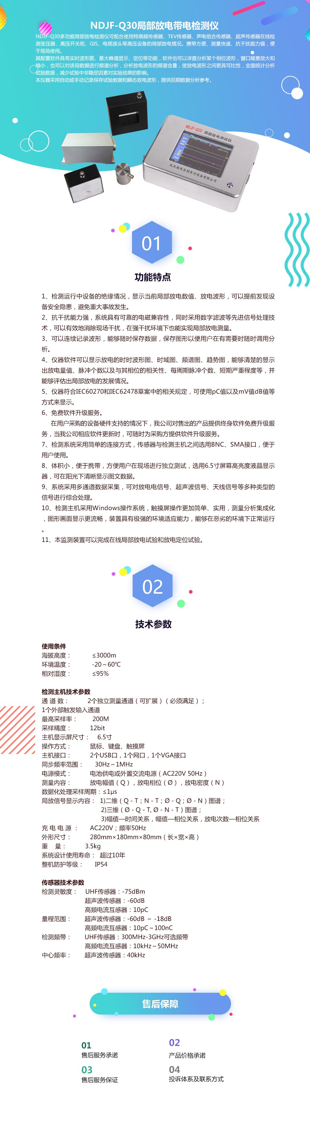 NDJF-Q30多功能局部放电检测仪可配合使用特高频传感器、TEV传感器、声电组合传感器、超声传感器在线检测变压器、高压开关柜、GIS、电缆接头等高压设备的局部放电情况。携带方便、测量快速、抗干扰能力强,便于现场使用。
