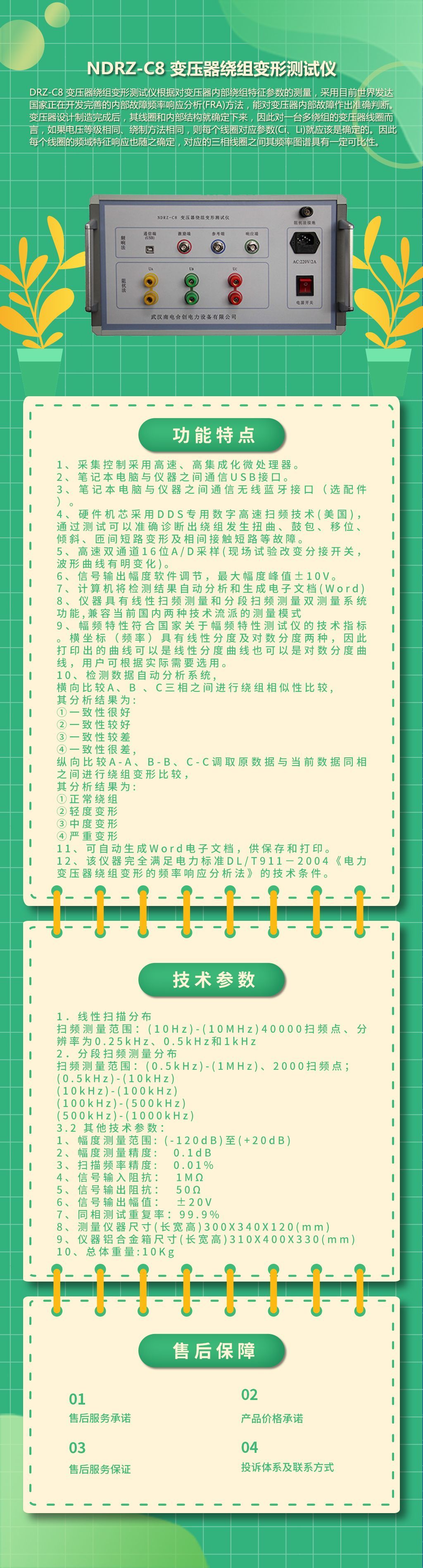 NDRZ-C8 变压器绕组变形测试仪根据对变压器内部绕组特征参数的测量,采用目前世界发达国家正在开发完善的内部故障频率响应分析(FRA)方法,能对变压器内部故障作出准确判断。