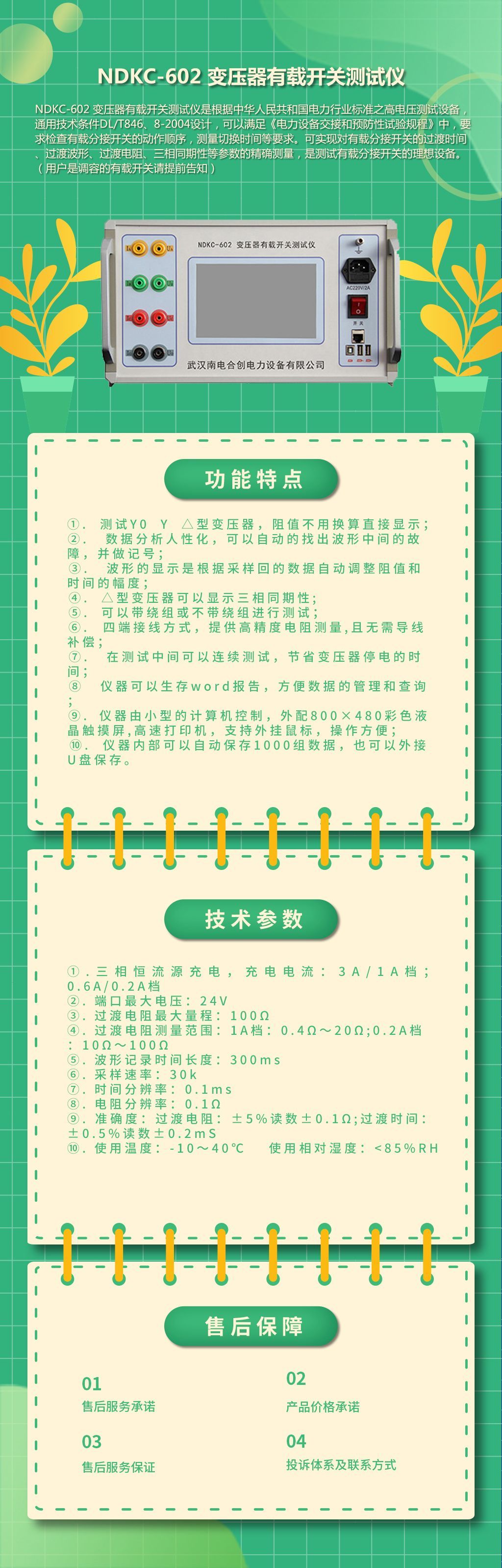 NDKC-602 变压器有载开关测试仪是根据中华人民共和国电力行业标准之高电压测试设备,通用技术条件DL/T846、8-2004设计,可以满足《电力设备交接和预防性试验规程》中,要求检查有载分接开关的动作顺序,测量切换时间等要求。可实现对有载分接开关的过渡时间、过渡波形、过渡电阻、三相同期性等参数的精确测量,是测试有载分接开关的理想设备。(用户是调容的有载开关请提前告知)
