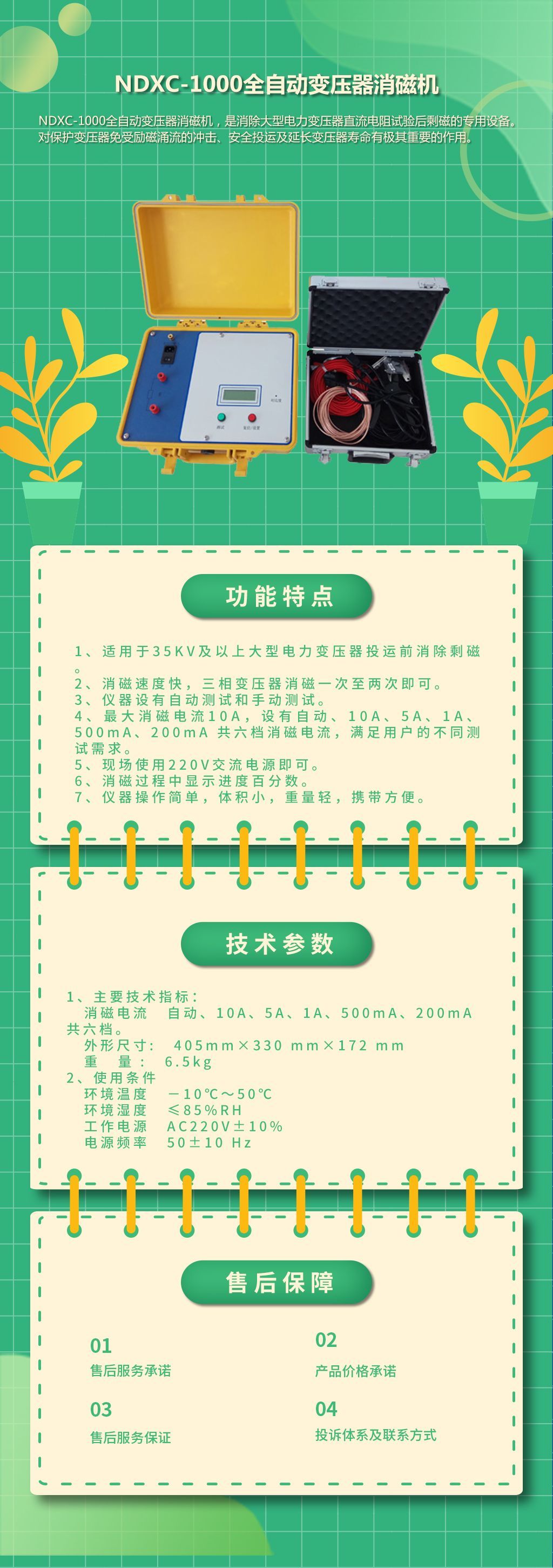NDXC-1000全自动变压器消磁机,是消除大型电力变压器直流电阻试验后剩磁的专用设备。对保护变压器免受励磁涌流的冲击、安全投运及延长变压器寿命有极其重要的作用。