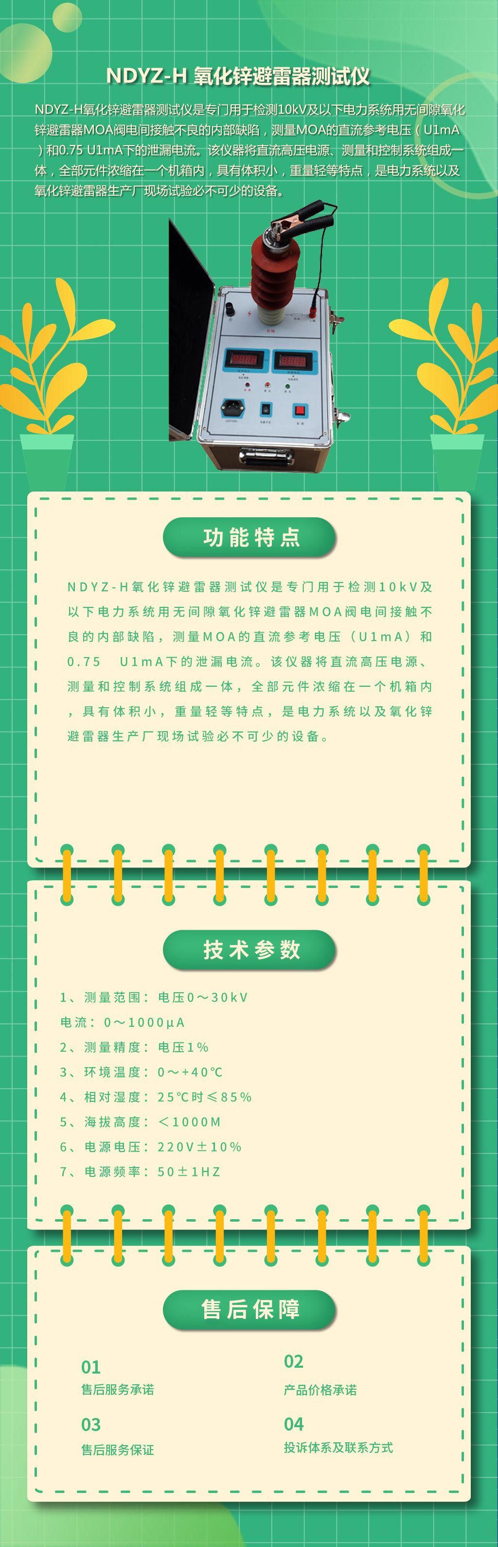 NDYZ-H氧化锌避雷器测试仪是专门用于检测10kV及以下电力系统用无间隙氧化锌避雷器MOA阀电间接触不良的内部缺陷,测量MOA的直流参考电压(U1mA)和0.75 U1mA下的泄漏电流。该仪器将直流高压电源、测量和控制系统组成一体,全部元件浓缩在一个机箱内,具有体积小,重量轻等特点,是电力系统以及氧化锌避雷器生产厂现场试验必不可少的设备。