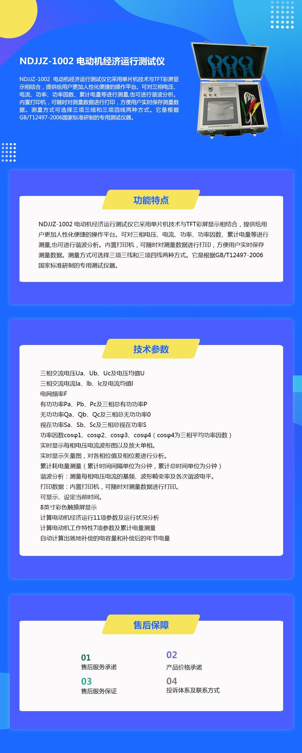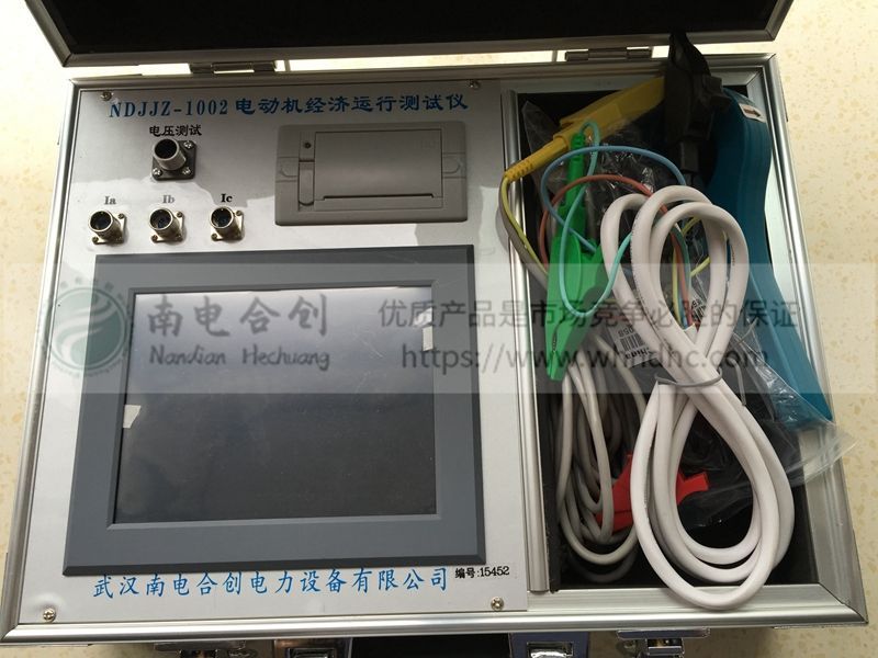 NDJJZ-1002 电动机经济运行测试仪它采用单片机技术与TFT彩屏显示相结合,提供给用户更加人性化便捷的操作平台。可对三相电压、电流、功率、功率因数、累计电量等进行测量,也可进行谐波分析。内置打印机,可随时对测量数据进行打印,方便用户实时保存测量数据。测量方式可选择三项三线和三项四线两种方式。它是根据GB/T12497-2006国家标准研制的专用测试仪器。